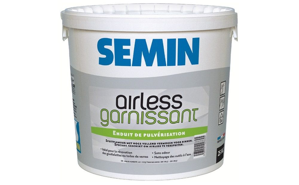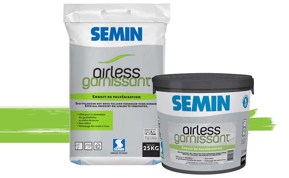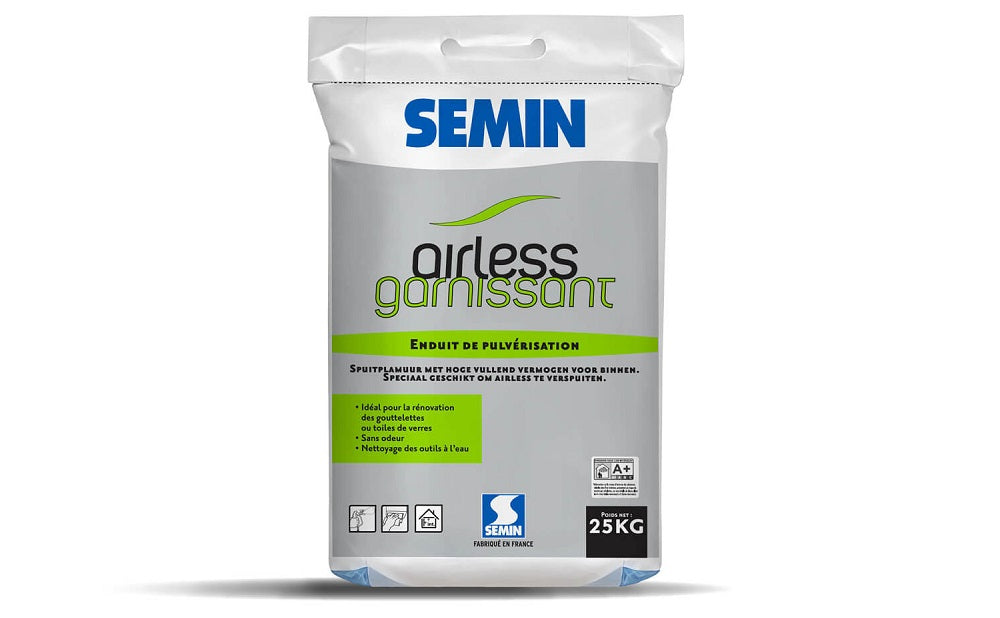 SEMIN AIRLESS GARNISSANT é um reboco interior utilizável em projeção Airless. Ideal para a preparação das pré-lages, betões batidos e para a renovação dos rebocos tipo “gota” ou das telas de vidro antes do acabamento pintura.