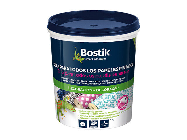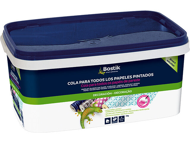 A cola para papel de parede Bostik é um adesivo sem solventes, de cor rosa, que se torna transparente após a secagem.