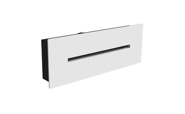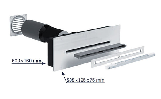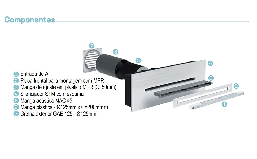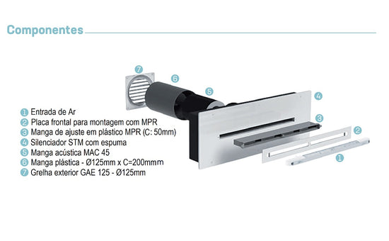 Corte o revestimento nas dimensões exteriores da caixa, ou seja, no mínimo 160 x 500 mm, tomando como referência o eixo do furo de Ø 125 centrado no silenciador. Retire a parte frontal do silenciador. Fixe 2 grampos à parede para aparafusar a caixa STM (4 furos pré-perfurados), com a estrutura encostada à parede de gesso para um acabamento perfeito. A junta na parte traseira evita fugas. Encaixe e aparafuse a tampa à caixa utilizando 6 parafusos. Aparafuse a entrada de ar.