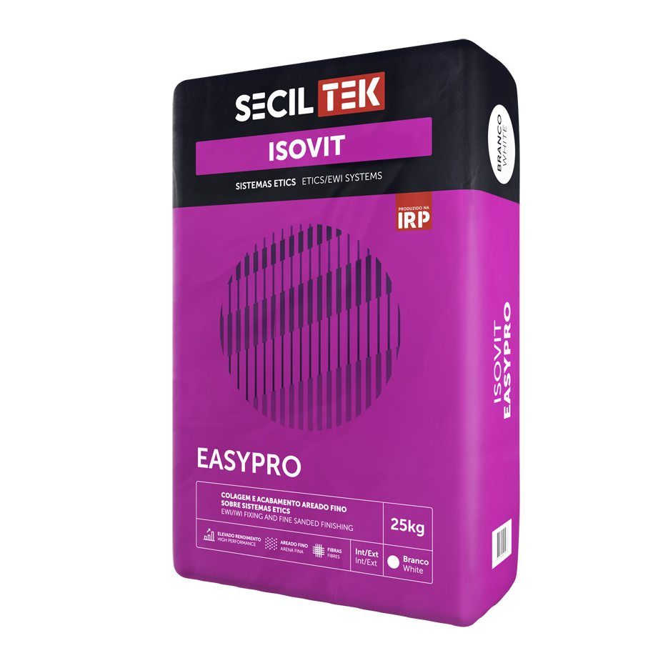 - O ISOVIT EASYPRO é uma argamassa de colagem e regularização, formulada a partir de ligantes mistos, agregados selecionados e adições, que proporciona um acabamento areado fino, pronta a receber um esquema de pintura.