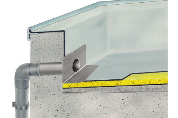 - O ralo de telhado inclinado a 90° oferece a possibilidade de ser usado para descarga direta de terraços, podendo estar ou não conectado a tubos de descida.