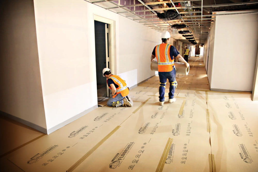 Como aplicar: 1. Desenrole o rolo de FloorShell® diretamente sobre o piso seco e limpo. 2. Corte à medida da área a proteger e, se necessário, fixe as extremidades com fita adesiva. 3. A lateral vincada pode ser dobrada junto aos rodapés para uma proteção adicional. 4. Após a utilização, pode ser recolhido, limpo e reutilizado em outra obra.