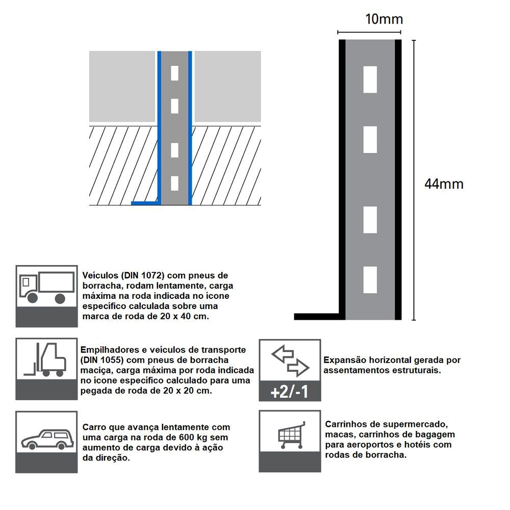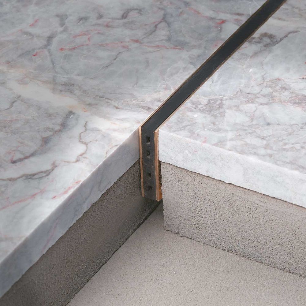 Junta de dilatação metálica com inserto de desbaste específico para ladrilhos palladianos, mármores e granitos, resistente aos tratamentos de acabamento, rebarbação e polimento em obra.