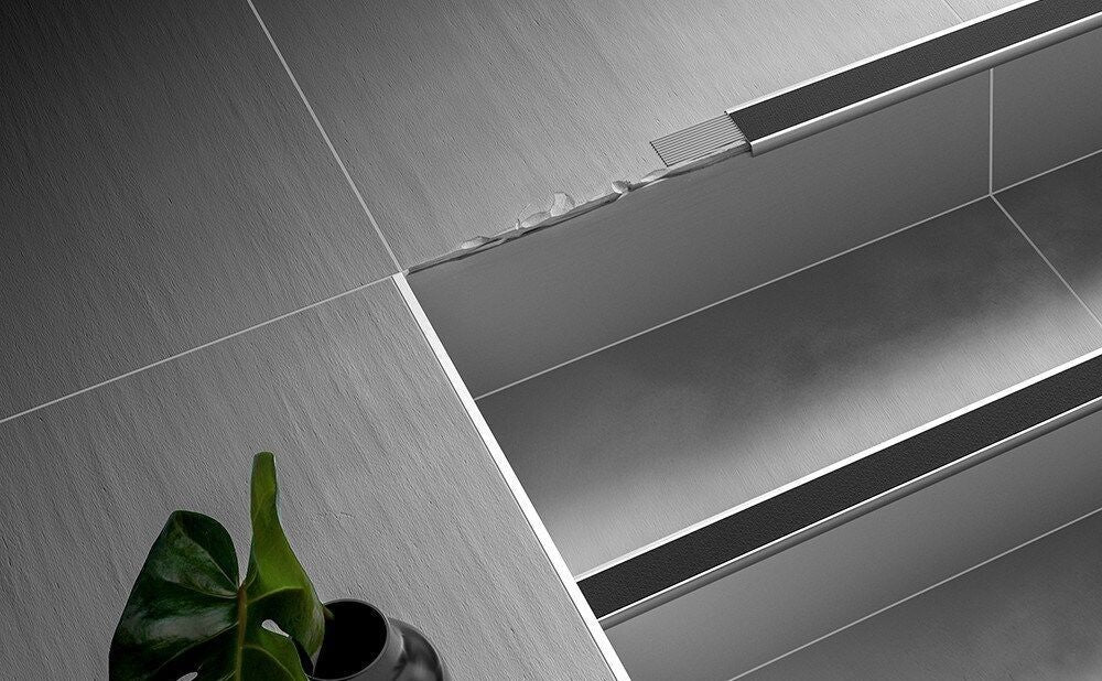 Schlüter-TREP-GK-S e GLK-S em inox escovado são variantes do perfil para escadas TREP-G/-GL sem abas de fixação.