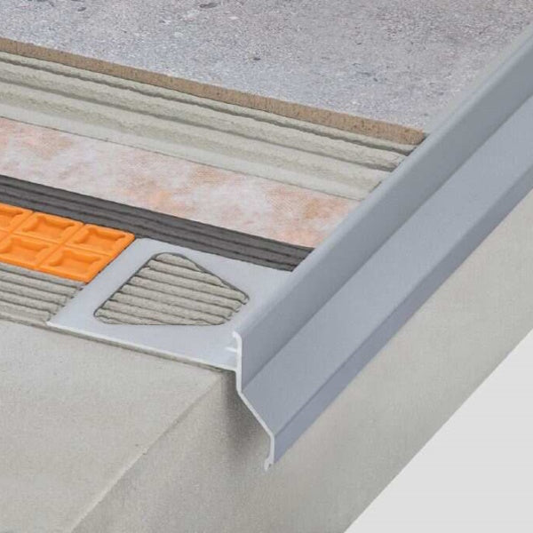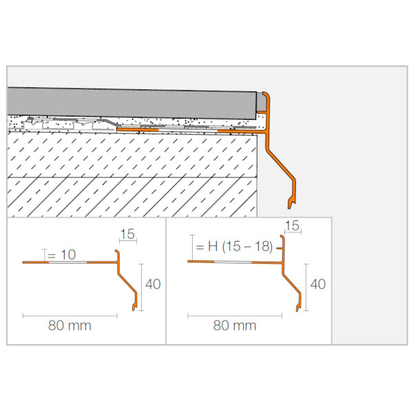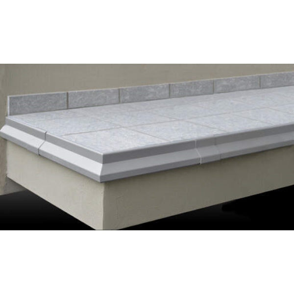- Perfil de remate em forma T com aresta de gotejamento curta para colocação em betonilha pronta inclinada e rebordo fechado que permite um remate cerâmico perfeito;