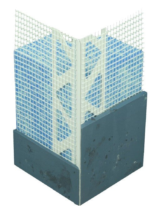 Perfil de canto em pvc branco 40x40mm em forma Y com rede de fibra de vidro 12,5x12,5cm, enchimento de argamassa com 5 a 8mm.