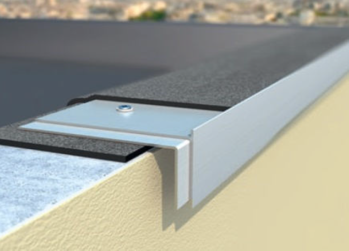 - Perfil de terminação e pingadeira de telas de impermeabilização para terraços e coberturas sobre muretes, paredes cegas.