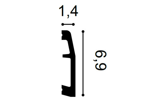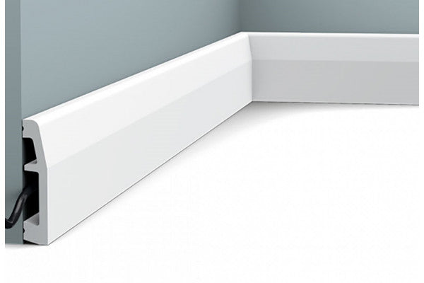 Rodapé fabricado em polímero extrudido (poliestireno de alta densidade).