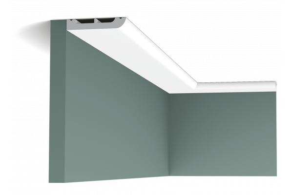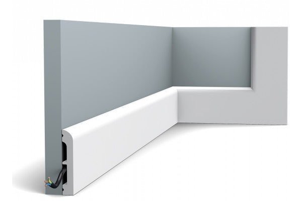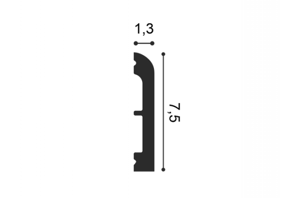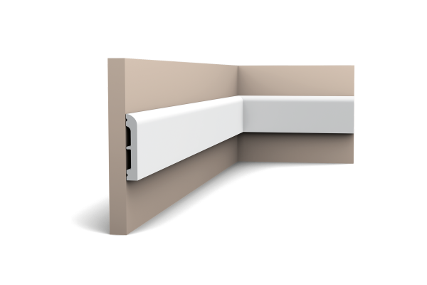 Rodapé fabricado em polímero extrudido (poliestireno de alta densidade).