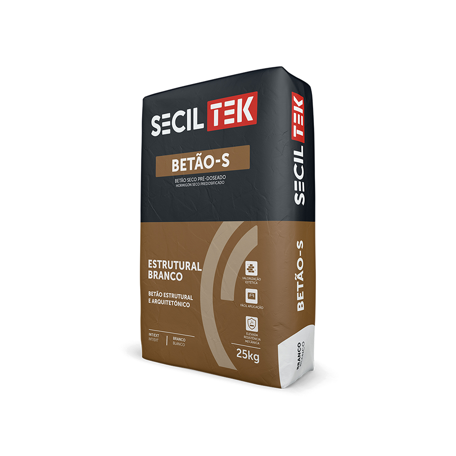 - O BETÃO-S ESTRUTURAL é formulado a partir de ligantes hidráulicos (cimento branco ou cimento cinza), agregados calcários e siliciosos de granulometria máxima de 10 mm, bem como adjuvantes em pó, que contribuem para uma correta reologia do betão fresco, facilitando a sua aplicação e proporcionando um excelente desempenho ao nível da sua durabilidade, além de pigmentos para a versão colorida.