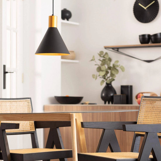 Este tipo de candeeiros de desenho industrial permite-nos dar aquele toque de anos 60 adaptado à decoração actual que trará personalidade a qualquer espaço tornando-o único. O Candeeiro Suspenso Metal Orbat é feito de alumínio com acabamentos em preto e ouro.