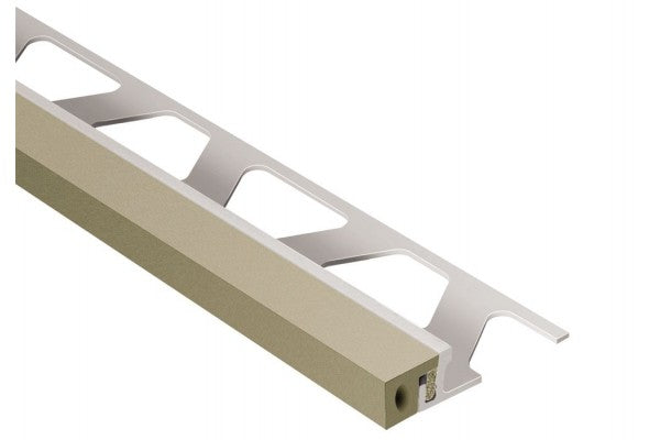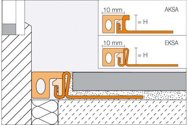 Perfil dilatação 10mm em alumínio ou inox + pvc flexível.