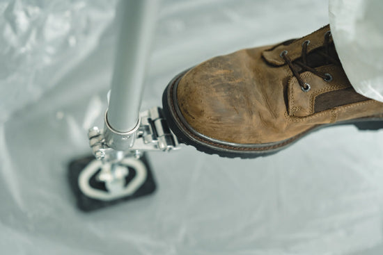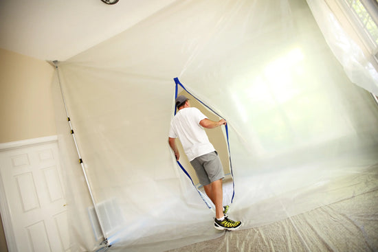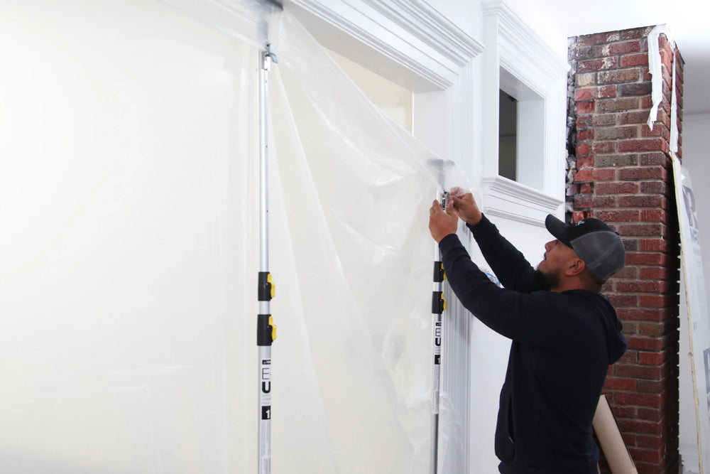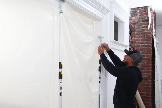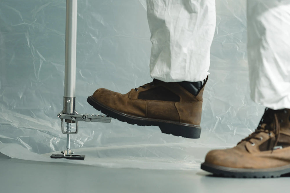 Poste profissional para contenção de pó, ajustável até 4,88 m. Desenhado para zonas com tetos altos ou obras industriais. Montagem segura e rápida com sistema de pedal.