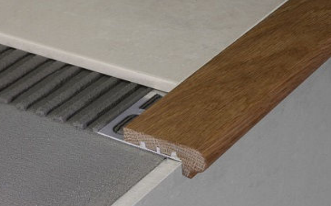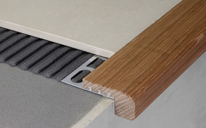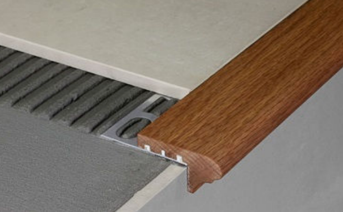 Perfil escada com madeira (Carvalho e Mogno) e base de alumínio para colocação sob cerâmica, pedra, madeira ou tijoleira.
