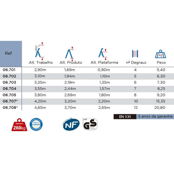 - Versões de 10 e 12 degraus com ampla plataforma aluminio 300x290mm e montantes de acesso lacados.