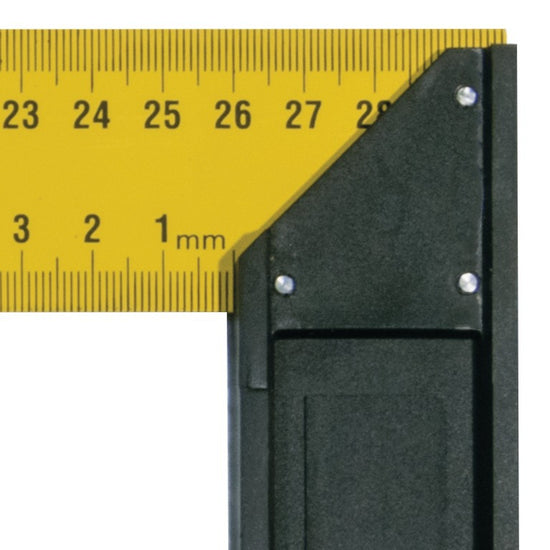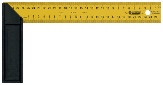 Lâmina de aço temperado com acabamento em laca amarela graduada em ambos os lados e fixada com 3 pinos no calcanhar.