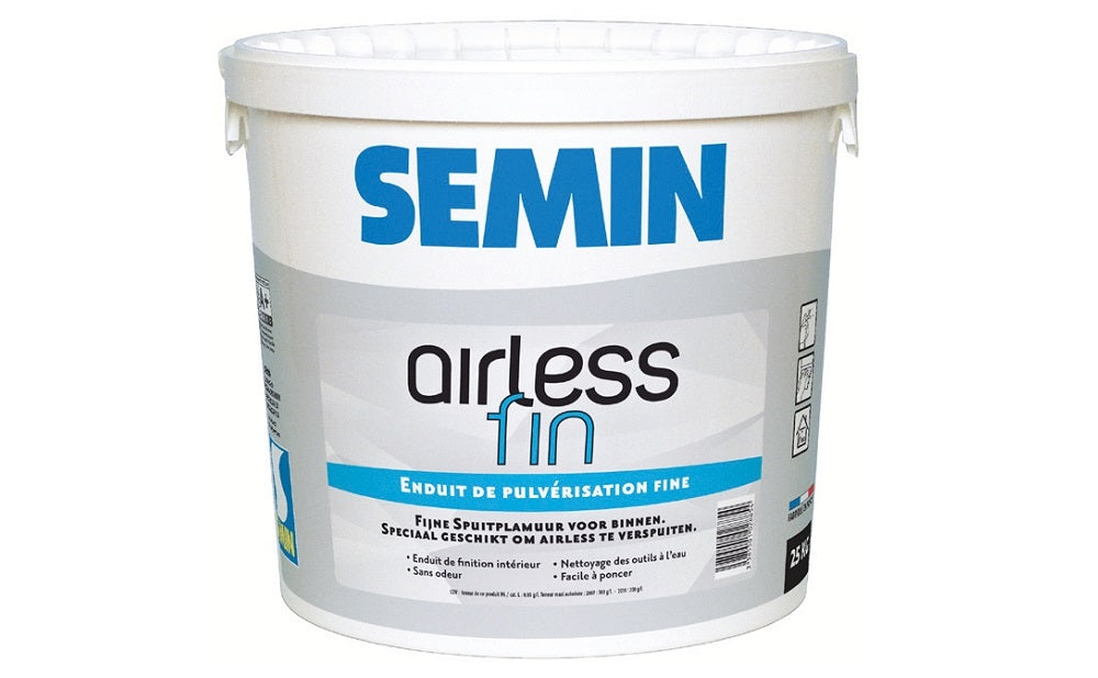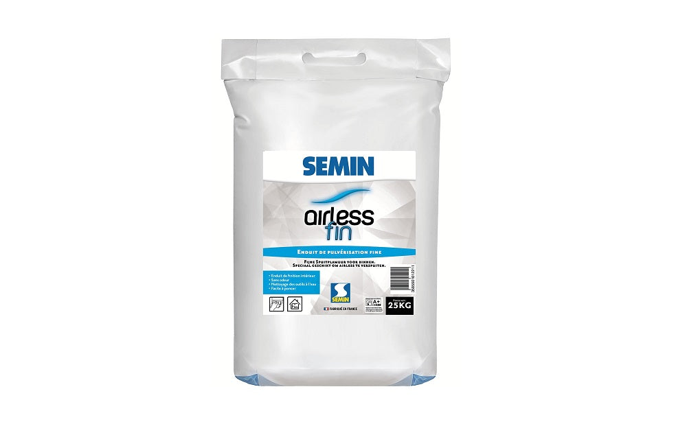 SEMIN AIRLESS FIN é um reboco de acabamento interior utilizável em projeção Airless. Ideal para a preparação das pré-lages, betões batidos e placas de gesso antes do acabamento de pintura. SEMIN AIRLESS FIN proporciona um acabamento